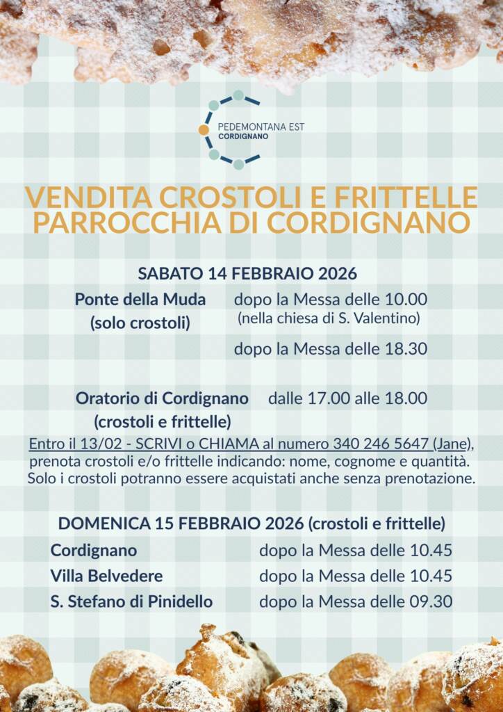 Per la chiesa arcipretale Dopo l’apprezzamento riscosso il 24 e 25 gennaio scorsi, il gruppo di volontarie e volontari cordignanesi curatore dell’iniziativa proporrà nuovamente crostoli e frittelle nelle giornate di sabato 14 e domenica 15 febbraio.