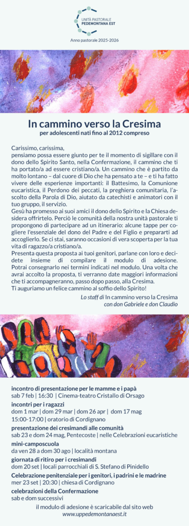 Nella locandina che segue, il messaggio indirizzato ai ragazzi e alle ragazze dell’unità pastorale nati fino al 2012 compreso e il calendario del percorso.